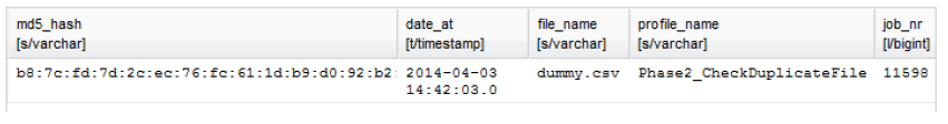 If a conversion is initiated with this environment check, the MD5 hash of the current source file will be determined and will be searched for in the database table. If it already exists, the conversion will be terminated. If the checkbox Is an error if the profile is called when suspended is deactivated in the profile, only a message under General Messages will be created in the Control Center and the job is