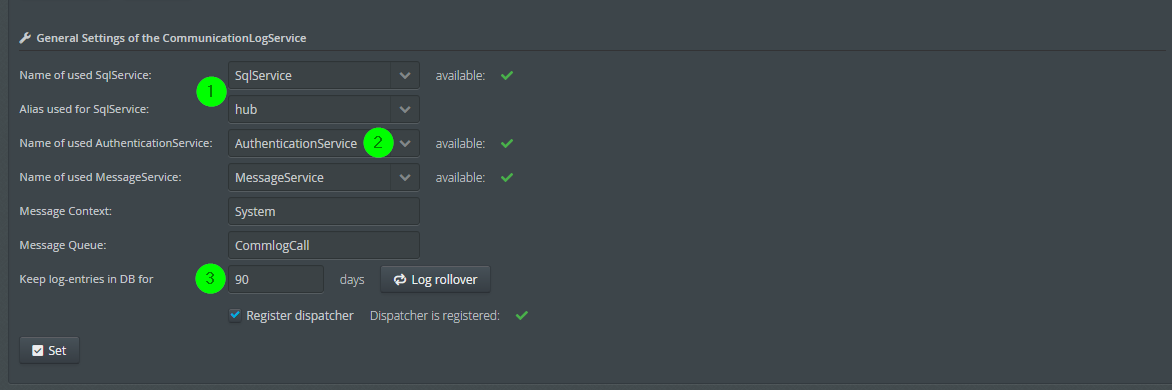 <Set name="logAlias">hub</Set><Set name="sqlServiceName">SqlService</Set>The following XML fragment shows the configuration for the retention time of log messages.