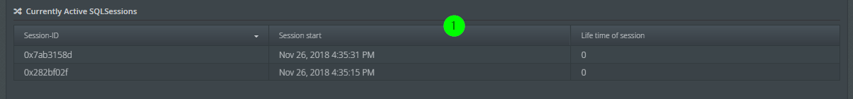 (1) List of active sessions. The session ID, the time of the start of the sessions and the set maximum lifetime for the session are displayed (0 = unrestricted). A session can be ended and details for the respective session can be displayed via the context menu, e.g. the stack trace of the generation of the session (This can be used to check which class has generated the session in which method).