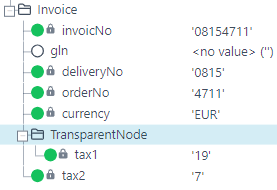 Blau markierte Knoten haben die Zielstruktur-Knoten-Eigenschaft XML/JSON Behandlung=Transparent.