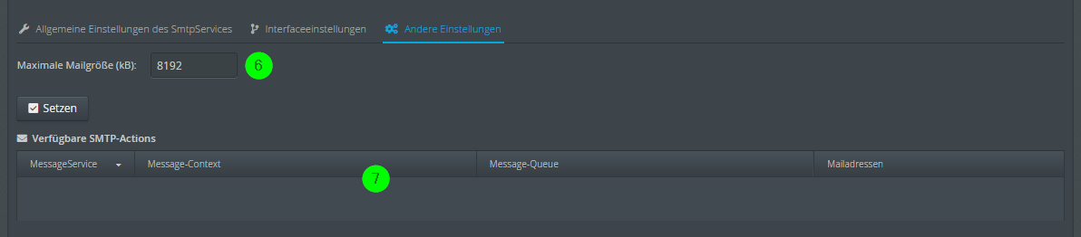 (6) Die maximale Größe in Bytes, die eine E-Mail haben darf, damit sie vom SmtpService akzeptiert wird. Die Größe ist in kB (1024 Bytes) anzugeben. Sollen also z .B. maximal 2 MB (die Standardeinstellung) akzeptiert werden, ist der Wert 2048 anzugeben. Der Wert -1 legt fest, dass kein Limit hinsichtlich der zu akzeptierenden Daten existiert.