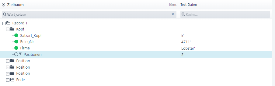Um zu veranlassen, dass nach Durchlauf aller Positionen der Wert im Kopfsatz ersetzt wird, legen wir einen neuen Knoten Ende mit einem Berechnungsfeld Wert_setzen an. Dieses Feld verwendet die Funktion replace marked value(a,b). Diese Funktion erlaubt es sozusagen rückwirkend den damals zukünftigen Wert pos_counter mit einem tatsächlichen Wert zu füllen.