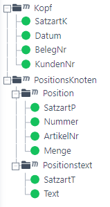 # # format description (UTF-8 encoded)# node name of parent;fieldname;min;max;description;matchcodes;type;length;format# root;Kopf;0;99999;;@@type:startsWith:KKopf;SatzartK;0;99999;;;String;0;Kopf;Datum;0;99999;;;String;0;Kopf;BelegNr;0;99999;;;String;0;Kopf;KundenNr;0;99999;;;String;0; root;PositionsKnoten;0;99999;;@@type:startsWith:P@@type:startsWith:T PositionsKnoten;Position;0;99999;;@@type:startsWith:PPosition;SatzartP;0;99999;;;String;0;Position;Nummer;0;99999;;;String;0;Position;ArtikelNr;0;99999;;;String;0;Position;Menge;0;99999;;;String;0;PositionsKnoten;Positionstext;0;99999;;@@type:endsWith:TPositionstext;SatzartT;0;99999;;;String;0;Positionstext;Text;0;99999;;;String;0;Will man manuell eine CSV-Strukturvorlage erzeugen, empfiehlt es sich zuvor eine vorhandene Struktur zu exportieren und Details in dieser Datei zu studieren.
