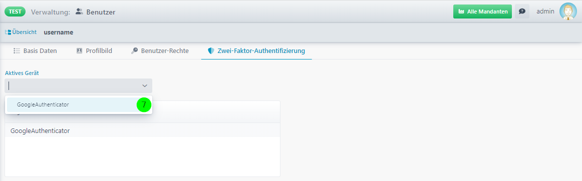 (7) Wenn alle vorherigen Schritte ausgeführt wurden, können Sie nun ein registriertes Gerät zum aktiven Gerät machen. Nachdem Sie gespeichert haben, ist die Zwei-Faktor-Authentifizierung aktiv für diesen Benutzer. Wenn Sie sich nun mit diesem Benutzer am Lobster_data anmelden, dann geben Sie zuerst Ihre normalen Zugangsdaten ein. Danach werden Sie aufgefordert einen Code einzugeben. Dann starten Sie z. B. Ihre Google Authenticator App auf Ihrem Smartphone, lesen den Code (der erzeugt wird mit dem Shared Key und dem TOTP-Verfahren) ab und tippen ihn im Lobster_data-Anmelde-Dialog ein (wo er überprüft wird mit dem Shared Key und dem TOTP-Verfahren).