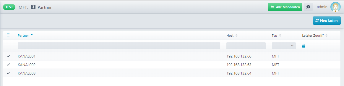 Hier finden Sie eine Übersicht aller Partner des MFT-Servers. Über das Kontextmenü können Sie neue Partner anlegen und bestehende bearbeiten und löschen. Das Gegenstück auf einem MFT-Client ist ein Mandant.