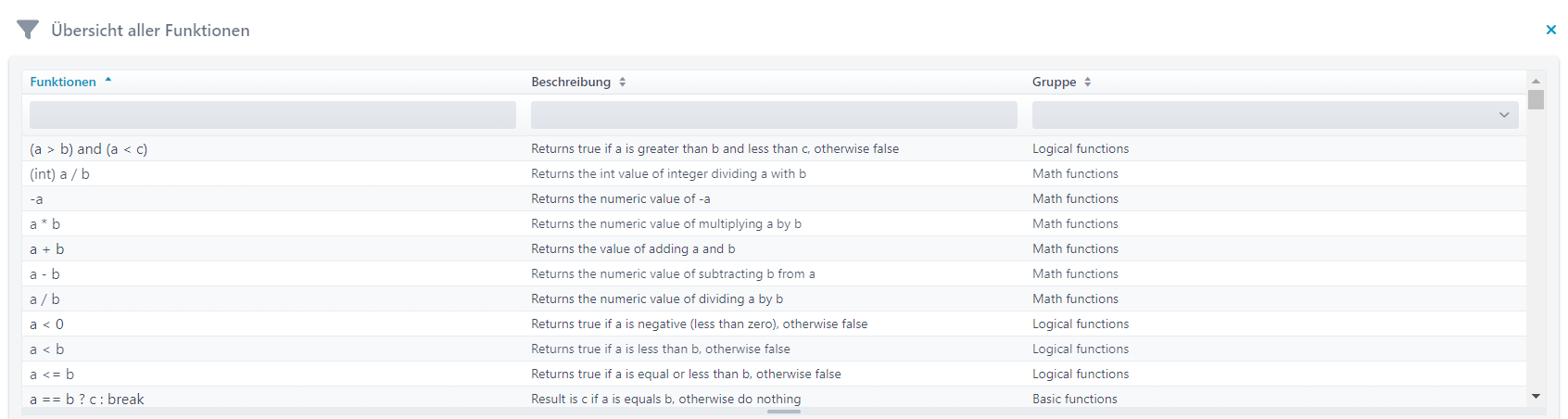 (4) Die Positionsnummer der jeweiligen Funktion in der Funktionskette. Wenn Sie die Maus direkt auf die Positionsnummer bewegen, erhalten Sie einen Tooltip mit einer Kurzbeschreibung der Funktion. Eine komplette Dokumentation der Funktion erhalten Sie über das Kontextmenü. Dort können Sie die Funktion auch löschen, kopieren und wieder einfügen.