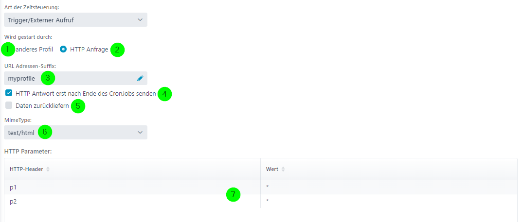 (4) Ist diese Option aktiviert, dann wird erst dann eine HTTP-Response zurück geliefert, wenn der Job für das Profil beendet wurde. Achtung: Wenn der Job sehr zeitintensiv ist, kann die Gegenstelle des HTTP-Request in einen Timeout laufen.