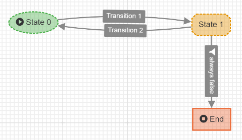 Ein Job dieses Workflows bewegt sich ständig zwischen State 0 und State 1. Hinweis: Die Transition zum End-Zustand hat eine niedrigere Priorität als Transition 2 und wird deswegen auch nie überprüft, weil Transition 2 immer greift (da keine Bedingung). Im Grunde könnte deswegen in diesem Beispiel auch die Bedingung in der Transition zum Zustand End weggelassen werden.