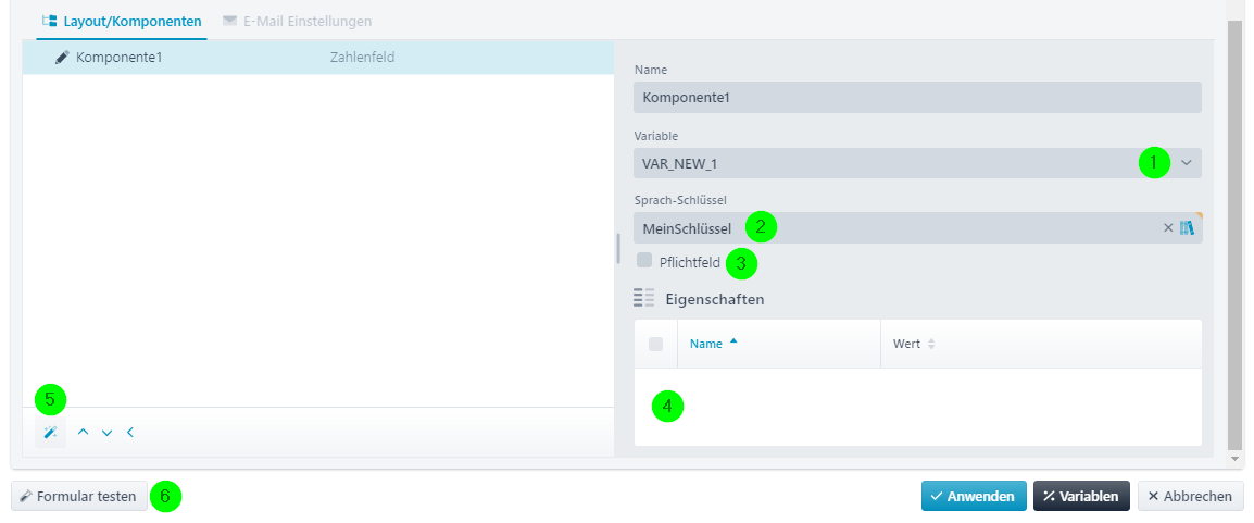 (1) Es muss eine Workflow-Variable ausgewählt werden. Das Erscheinungsbild des Feldes im Formular hängt ab vom Datentyp der Variable. Beispiele: Boolean wird als Checkbox dargestellt, Blob als großes Feld mit HTML-Editor, Date als Feld mit Kalenderauswahl, Timestamp als Feld mit Kalenderauswahl und Zeitauswahl. Die Formatierung von Zahlen- und Datumswerten hängt ab von der Sprache, mit der Sie sich angemeldet haben. Hinweis: Verwenden Sie den Formular-Test (6).