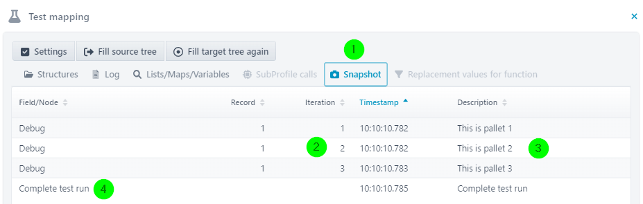 This function can take a snapshot of the data generated during the mapping until then. Snapshots can only be taken in a mapping test. Calling the function during an actual job has no effect.