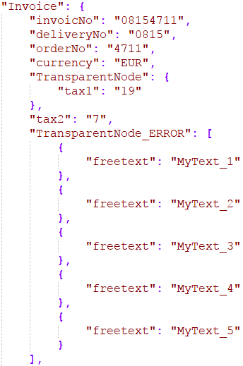 {"Rechnung": { "bestellnr":"4711", "ilnkaeufer":"400000045687", "ilnlieferant":"123456789", "lieferscheinnr":"0815", "position":[ {"ArtNrLieferant":"87490","EAN":"3654878784","inhalt":"Wurst","masseinheit":"ST","menge":"200","positionsNr":"1","preis":"30","ustsatz_pos":"19"}, {"ArtNrLieferant":"8786767","EAN":"546546","masseinheit":"ST","menge":"1","positionsNr":"2","preis":"56"} ], "rechnungsnr":"08154711", "ustsatz1":"19", "ustsatz2":"7", "waehrung":"EUR" }}Ist der Parameter Write top level nodes as objects auf false gesetzt, wird folgende Datei erzeugt.