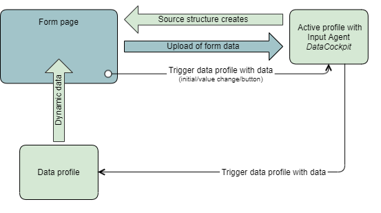 Hinweis: Die beiden Diagramme sind vereinfacht dargestellt, um die Datenquellen des Formulars zu zeigen. Technisch ist es so, dass das Daten-Profil seine Ausgangsdaten an das Formular-Profil (in das es ja eingebunden ist) zurück gibt und das Formular-Profil baut die Formular-Seite auf (mit den integrierten dynamischen Daten).