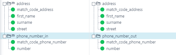 We review the result in the mapping test and see that we now have what we wanted. The twice repeated node "phone_number_in" from the source tree now causes the node "phone_number_out" in the target tree to repeat twice as well.