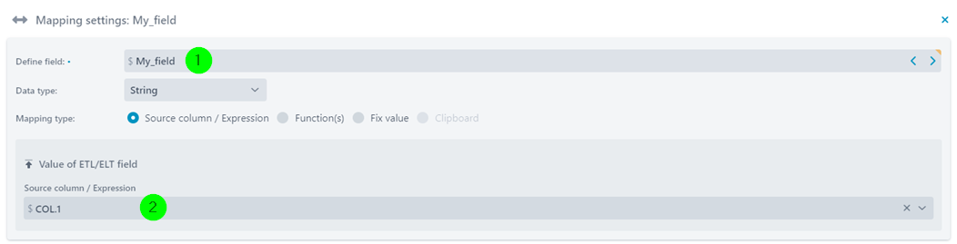 (2) Here you can select an ETL/ELT source column (COL.1 for column 1, etc.). For the source data types XML and JSON, you can also use XPath or JSONPath expressions here, which are then applied to the internally read-in subtree, see sections XML (source ETL/ELT) and JSON (source ETL/ELT). Examples: /title/@lang (XPath) and .book[2].category (JSONPath).