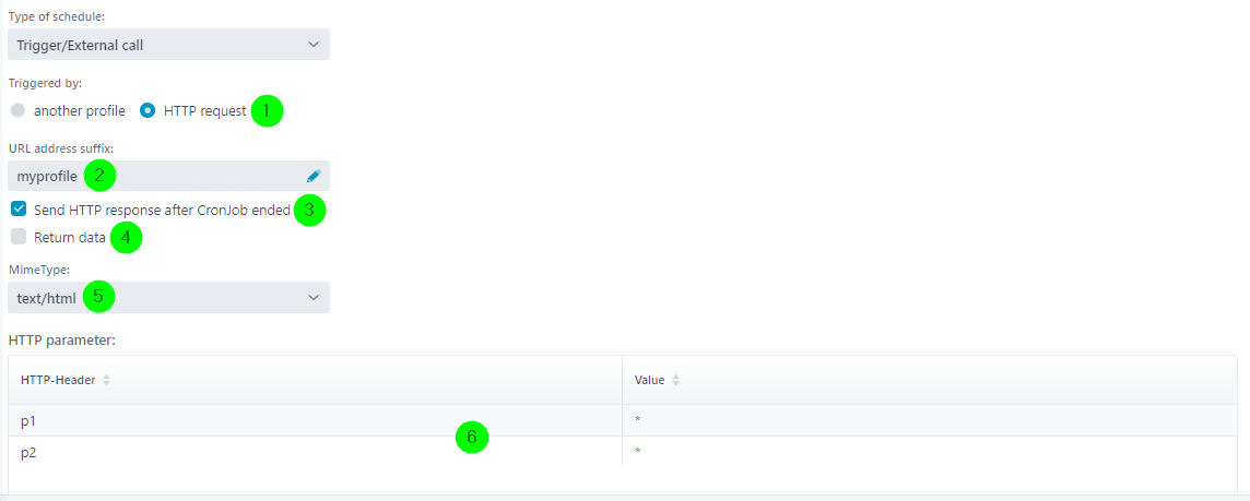 Additionally, the HTTP request parameters must match the HTTP request parameter definition (6). If, for example, you enter value "myprofile" in (2) and two parameters ("p1=value1", "p2=value2") in the parameter list (6), the URL must look like this.
