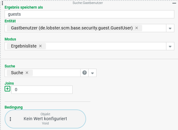 ►WICHTIG◄ Der Zweck dieser Abfrage besteht darin, die "Gespeicherte Abfrage" zu finden, deren "Bedingung" für die folgende Suche (Ereignisaktion) übernommen werden soll. Weder das Datenmodell noch die Erfassungsmaske für Gespeicherte Abfragen stellt sicher, dass der beim Speichern verwendete "Name" (name) eindeutig ist. Es können also mehrere Abfragen mit dem gesuchten Namen (hier: GUEST_USERS_FOR_COMPANY) existieren. Sofern für mehrere identisch benannte Abfragen im Ausführungskontext der Suche (Ereignisaktion) Zugriff besteht, wird hier nur der "erste" Treffer (s. Modus) als Rückgabewert berücksichtigt. Solange keine Sortierung verwendet wird, sollte das der Kandidat mit dem höchsten Wert für die ID (id) sein. Das ist in der Regel die zuletzt erstellte Abfrage, die der Bedingung entspricht. Im folgenden verzichten wir auf eine Prüfung, ob überhaupt ein Treffer erzielt wurde. Das ist für die Praxis bedingt empfehlenswert, da ohne weitere Vorkehrungen ggf. die nachfolgende Suche (Ereignisaktion) ohne Einschränkung ausgeführt wird, wenn die Suche rechts zur Laufzeit kein Ergebnis liefert. |