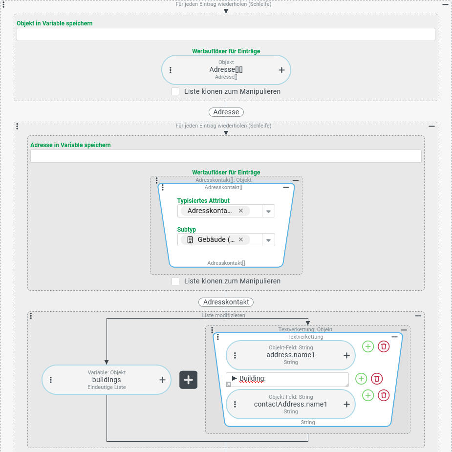 • Im Aktionsblock der inneren Schleife kombiniert ein Textverkettung-Wertauflöser Informationen aus der übergeordneten Adresse (address) und den Adressdaten im Adresskontakt (contactAddress) zu einer "Gebäudebezeichnung" für die Ausgabe.