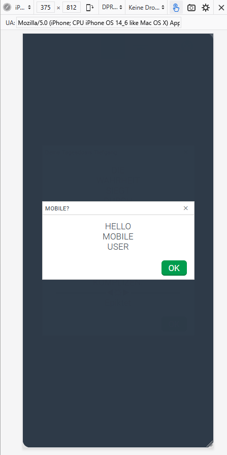 Die folgenden Screenshots zeigen das Erscheinungsbild des Anmeldedialogs in einem Simulationsmodus für Mobiltelefone und eine Meldung, die nur bei zutreffender Mobiles Endgerät?-Regel ausgelöst wird: