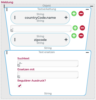 • Im ersten Schritt verkettet ein Textverkettung-Wertauflöser die Werte der Felder countryCode.name und zipcode, wobei als Trennzeichen (s. zweite Teilzeichenfolge) ein Leerzeichen eingefügt wird. Dabei spielt es zunächst keine Rolle, ob diese Felder gefüllt oder leer sind.