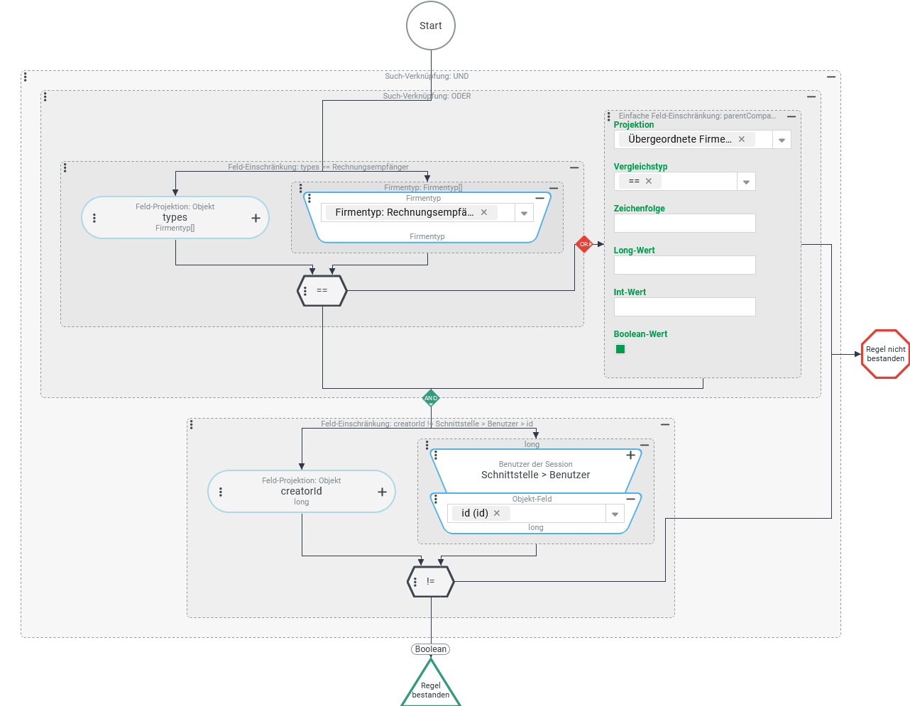 Das Nicht-Bestehen einer einzigen der verknüpften Einschränkungen bewirkt eine Abzweigung nach rechts zum Gesamtergebnis Regel nicht bestanden.