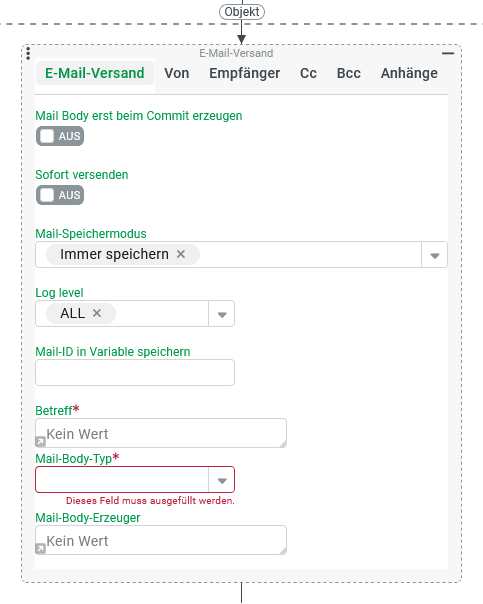 Die Option Mail-Body erst beim Commit erzeugen ist per Standard abgewählt (AUS), was bewirkt dass alle Wertauflöser in der E-Mail-Versand-Konfiguration sofort beim Ausführen der Ereignisaktion verarbeitet werden.