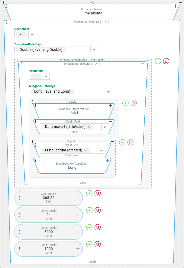 Als Beispiel für die Möglichkeit aus mehreren Instanzen des Einfache Berechnung (+,-,*,/,%)-Wertauflösers ein Aggregat mit unterschiedlichen Rechenoperationen aufzubauen, soll hier das "Alter" eines konkreten Firmenkontos in Jahren ermittelt werden.