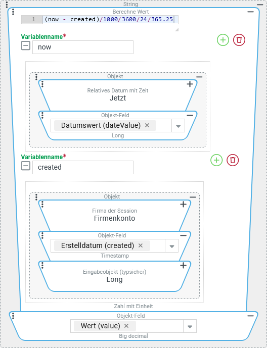 Im Unterschied zum Einfache Berechnung (+,-,*,/,%)-Wertauflöser müssen die Wert-Konfigurationen für Eingangswerte auf dem Umweg über willkürlich benannte Variablen (now, created) in die Berechnung eingebunden werden. Die Variablen können dann zusammen mit statischen Werten direkt verwendet werden, um die Berechnung zu formulieren (ganz oben im Bild rechts). Um am Ende den reinen Zahlenwert aus dem Berechnungsergebnis zu erhalten, dass formal als "Zahl mit Einheit" erzeugt wird, muss explizit auf das Objekt-Feld "Wert" (value) zugegriffen werden. Der direkte Vergleich zeigt, dass der Berechne Wert-Wertauflöser bereits in diesem noch nicht zu komplexen Anwendungsfall das benötigte "Aggregat" kompakter und übersichtlicher abbilden kann als die vergleichbare Konfiguration mit zwei verschachtelten Einfache Berechnung (+,-,*,/,%)-Instanzen im Beispiel oben. Mit der Anzahl der zu aggregierenden Rechenschritte wächst eine Konfiguration, die Einfache Berechnung (+,-,*,/,%)-Instanzen verschachtelt, überproportional stark an, sodass der Vorteil eines "Berechnungsausdrucks", der Eingangsdaten als Variablen benennt und diese in eine als "Gesamtansatz" definierte Beziehung setzt, immer deutlicher wird. Analog wäre für einen Berechnungsausdruck abzuwägen, ob man für Aggregate auf Basis der Grundrechenarten die Funktionen sum (Addition), dif (Differenz), product (Multiplikation) und quotient (Division) anstelle calc (Funktionsausdruck berechnen) mit einem Gesamtansatz einzusetzen. |