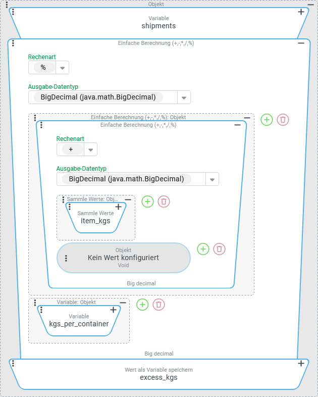 Der Screenshot rechts zeigt eine Wertauflöserkette (s. Verketteter Wertauflöser), die ausgehend von der Liste der Sendungsdaten in der Variable shipments die Berechnung der theoretischen "Teilladung" vornimmt: