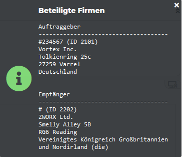 Ergebnis: Ausgabe des Rückgabewerts des Wertauflösers in einem Popup vom Typ "Info": Beispiel: Ein ähnlicher Adressblock soll für ausgewählte Auftraggeber-Firmenattribute (Firmentyp AAL, CNE) einer Bestellung erzeugt werden: {$with ({/core:Print/printObjects/ord:Order/attributes/ord:OrderCompanyAddress/value[@companyType='AAL']/company/address}){$r(de.lobster.scm.base.company.CompanyType,{../../@companyType})}-------------------------------------#{@accNumber} (ID {../@id}){@name1} {@name2} {@name3} {@street1} {@streetNo}{@zipcode} {@city}{$r(de.lobster.scm.localization.Country,{@countryCode})}}{$with ({/core:Print/printObjects/ord:Order/attributes/ord:OrderCompanyAddress/value[@companyType='CNE']/company/address}){$r(de.lobster.scm.base.company.CompanyType,{../../@companyType})}-------------------------------------#{@accNumber} (ID {../@id}){@name1} {@name2} {@name3} {@street1} {@streetNo}{@zipcode} {@city}{$r(de.lobster.scm.localization.Country,{@countryCode})}}