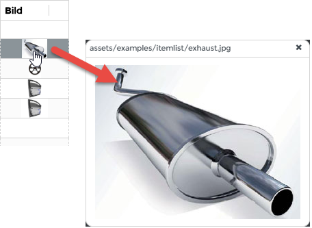 { "list":{ "listname":"Autoteile", "listitems":[ { "id":"1", "name":"Auspuff", "description":"Durchmesser: 20mm", "image":"assets/examples/itemlist/exhaust.jpg" }, { "id":"2", "name":"Lenkrad", "description": "Minimalausführung", "image":"assets/examples/itemlist/steeringwheel.jpg" }, { "id":"3", "name":"Tür (Vorne links)", "description":"Farbe: rot; Türheber elektrisch", "image":"assets/examples/itemlist/cardoor.jpg" }, { "id":"4", "name":"Tür (Vorne rechts)", "description":"Farbe: rot; Türheber elektrisch", "image":"assets/examples/itemlist/cardoor.jpg" } ] }}In der oben gezeigten Datei beinhaltet "listitems" die Liste der Zeilen für das Datengrid. Somit wird das Datenfeld des Grids entsprechend auf "listitems" gesetzt. Die Schlüssel der Zeilenobjekte hingegen entsprechen den Datenfeldern der Spalten.