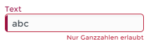 Für dasselbe Feld können dabei mehrere Validierer konfiguriert werden, wobei jedem Validierer eine bestimmte Prüfbedingung und ein "Infotext" zugewiesen wird, der unterhalb des Elements erscheint, wenn die Prüfung fehlschlägt. Falls mehrere Validierer konfiguriert sind, erfolgt die Prüfung in der per Drag & Drop wählbaren Reihenfolge innherhalb der Konfiguration und der erste Fehlschlag liefert den Infotext für die Anzeige unterhalb des Elements (s. Beispiele unten). Für Pflichtfelder hat die Prüfung auf "leer" allerdings immer höchste Priorität. Solange ein Pflichtfeld leer ist erscheint deshalb immer der Standardtext ("Dieses Feld muss ausgefüllt werden.") unter dem Element.