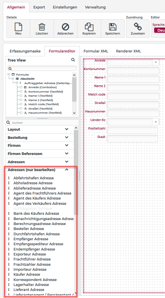 In the Form editor, a list of address containers for each Company type is displayed in the form elements under the drop-down entry 'Addresses', or 'Addresses (edit only)', whereby exactly one container for each company type only can be used in a form, i.e. as soon as a container is dragged into the form, the corresponding entry in the list appears grayed out (see 'Principal address' in figure 1 below) and cannot be used a second time.