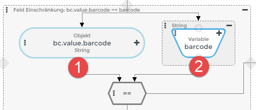 The Field constraint (1) is now 'bc.value.barcode' which is compared via the value resolver Variable (2).