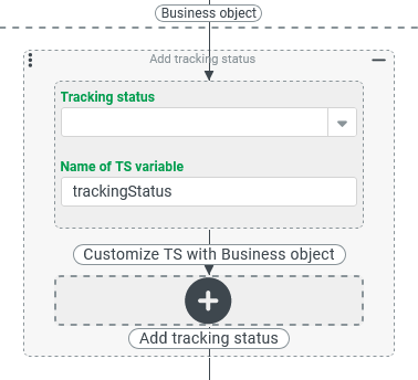 The Name of TS variable name parameter is optional, but must specify a variable name for the newly created tracking status entry if access to the tracking status entry is required for the event actions in the block Customize TS with <entity type>. Therefore, by default, the variable name trackingStatus is preset.