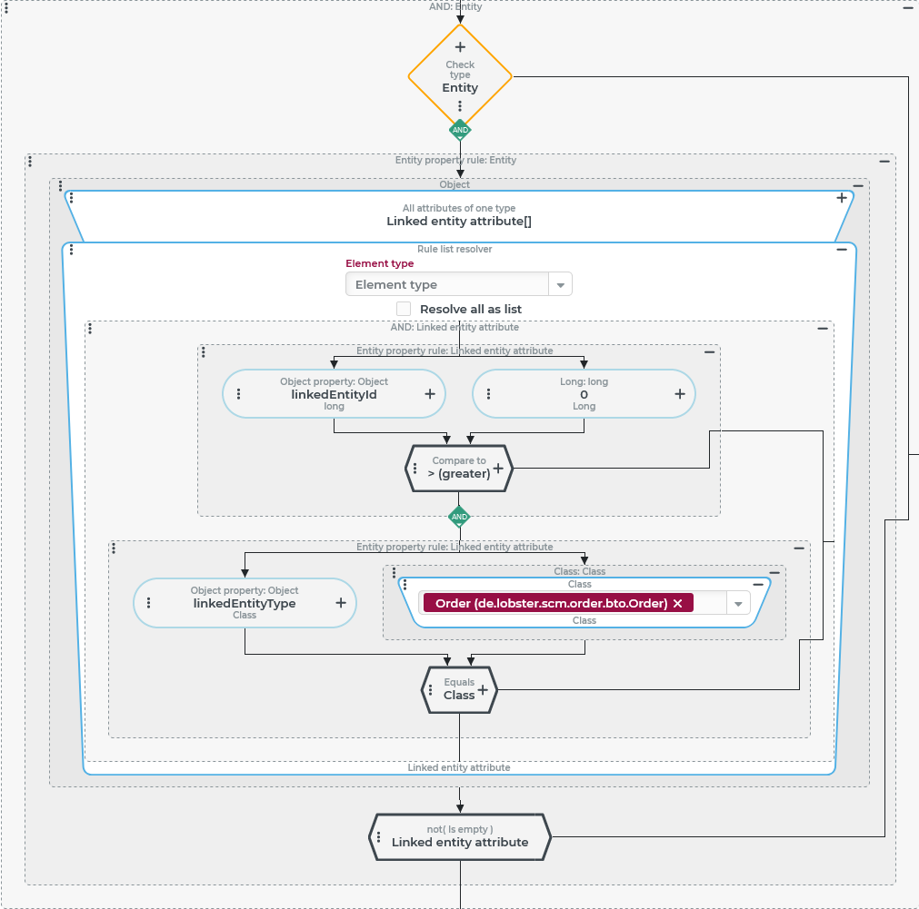 Within an AND Junction, a Check type first checks whether the input value belongs to the parent class 'Entity'. Only if this is the case does the linked Entity property rule, in conjunction with the negated Is empty compare type, examine whether the entity in the input value has a linked entity attribute that refers to a specific 'Order':
