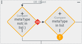 The screenshot on the right shows the ‘negated’ Entity property rule. The ‘!’ indicator appears as an icon at the bottom of the rectangular shape and as a prefix in front of the text in the title bar (‘!Compare...’). |