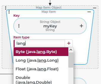The optional Item type parameter supports a static single selection for a class via a Combobox. Its search function (see image on the right) considers matches for the applicable localization as well as the internal name of the class. A selection for Item type value implies a Check type for the read or assigned value, and may – if automatic conversions are provided – also cause a type conversion or lookup of enumeration values or entities with respect to the return value. Example: For example, if the text value 0815 (in JSON notation '0815') was assigned to the key myKey, then this can be 'read' during a read access either as a String value (0815) or as a Long value (815) depending on the selection for the Item type. If the Item type Long was already specified in the context of assigning the 0815 text value to the myKey key, then the Long value 0815 is assigned. The information that the original string contained a 'leading zero' is lost in the process. However, the stored long value (815) can be used to 'look up' an entity with ID (id) 815 on read access by selecting its entity type as Item type if the context supports it (see table above). |