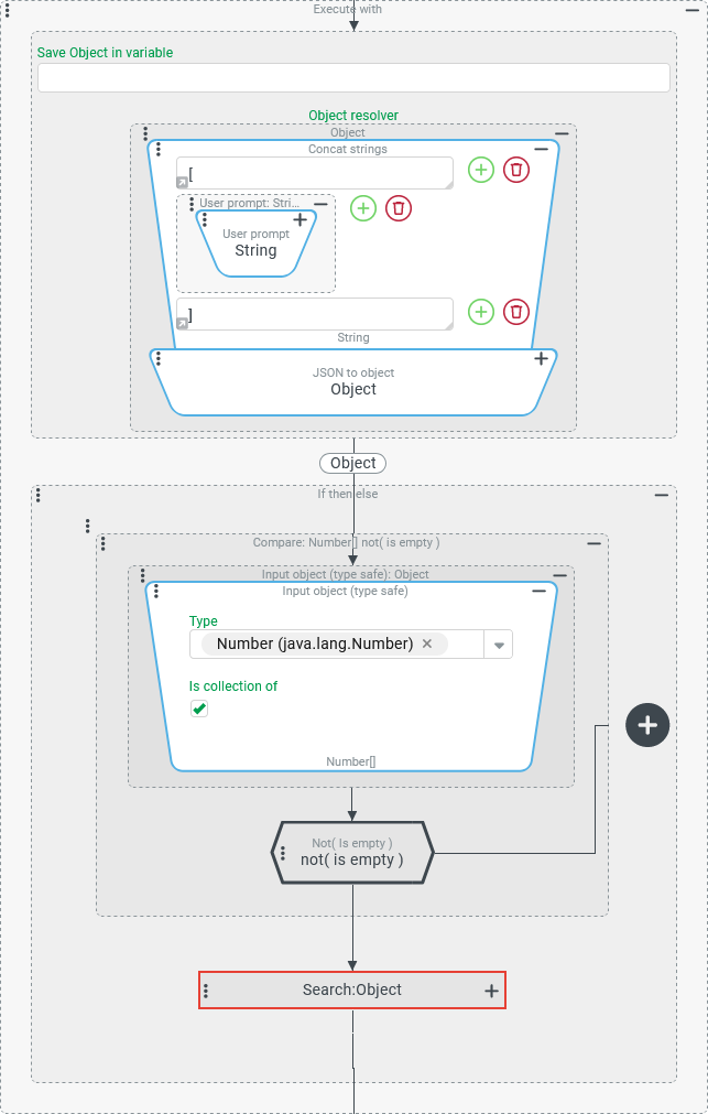• If this is the case, or if the user enters non-numeric characters apart from the separating commas, the Search (Event action) in the action block is not executed. This is made possible by the Input object (type safe) value resolver, which is used here to check whether the data object in the input value is a list of numerical values. The Type selected for this is 'Number' java.lang.Number, i.e. a higher-level class for specific data types such as 'Long' or 'Double'.