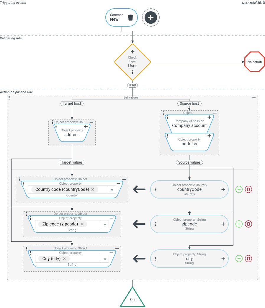 The value configuration for the Target host is optional. In the example (right), an Object property resolver defines an address field with the 'Address' (Address) entity type in the data model of the reference object in the execution context as a Target host, so that its fields can be used as Target values in assignments. |