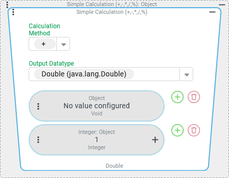 The Simple calculation (+,-,*,/,%) value resolver combines several numerical values with one of the four basic arithmetic operations in order to return a scalar result – i.e. a 'Number without a unit':