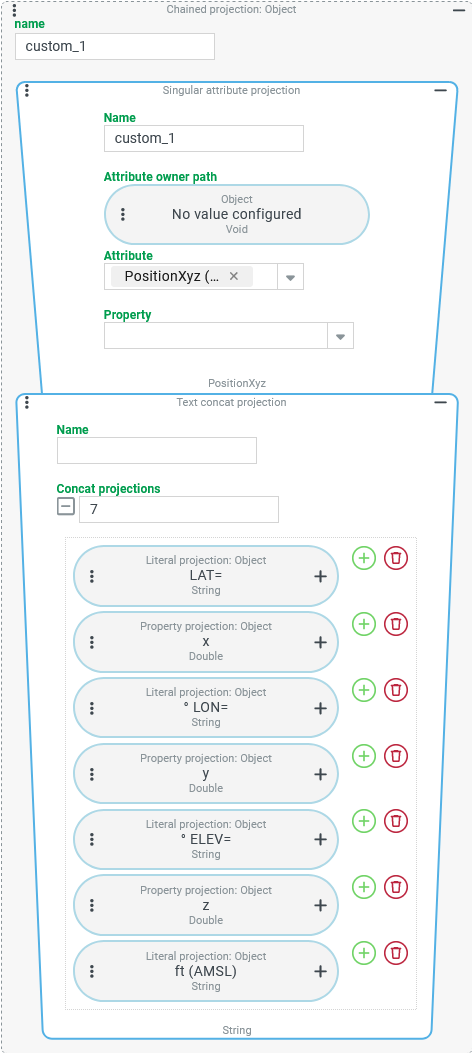 ►NOTE◄ As the runtime example (above) illustrates, the Double values saved as coordinates appear here with a large number of decimals. When constructing the output string in the context of the Concatenated projection, there is no function available for formatting the numerical values with a limited precision.