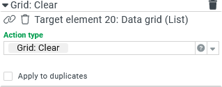 If the service configuration of the target element specifies a Data object service, Grid: Clear will be ineffective at runtime, provided that service is still relevant and has not been replaced, e.g. by the action Grid: Fill. |