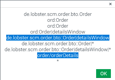 If a view cannot be opened, no error (process exception) occurs so that subsequent actions and behaviours are executed. However, this does not apply to an optional follow-up process triggered by Execute behaviour after closed. This does not apply if no view is opened, because then no view is closed. How can I determine the view name and the menu node name? The view name and menu node name of a view that is already open can be determined by clicking on the ?-symbol at the top right of the window title while holding down the key combination STRG+ALT (or. CMD+ALT for Mac). In the context of an Bestellungen input form, this results in the following message: