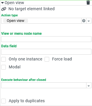 By default, the dropdown for the Execute behaviour after closed parameter only lists the behaviour names that are defined for the form element with the calling behaviour. To be able to select and execute a behaviour for another form element within the same form, the element in question must first be linked as a Target element for the Open view (Form designer) action. By default is is set as No target element linked. The target element link can be found – as usual – in the first place under the properties of the action. The editing mode for the link is activated with a mouse click.