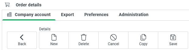 ►NOTE◄ By default, company accounts are maintained via a 'Combined view', in which the default data input form is used in conjunction with a data grid. A separate menu item for opening a data input form for company accounts therefore does not appear. A pure input form can still be opened directly via the view name de.lobster.scm.base.company::CompanyAccount|detailsWindow.
