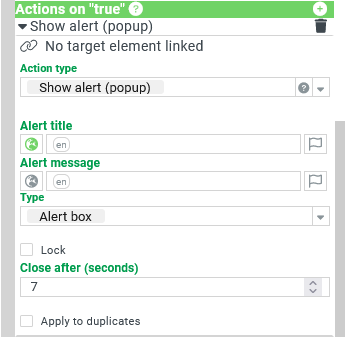 Optionally, a Target element can be linked, which is to receive the focus in connection with the alert. If the Target element allows this, based on its type and the settings valid at runtime, the following happens: