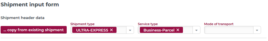 If there are already data entries for the Shipment type, Service type and Mode of transport fields for the selected shipment in the overview, these are copied into the input form for the shipment.
