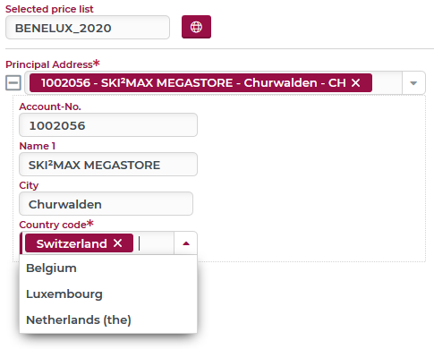 The Selected price list 'BENELUX_2020' selected here applies – as the name suggests – for the countries Belgium (BE), Luxembourg (LU), and the Netherlands (NL).