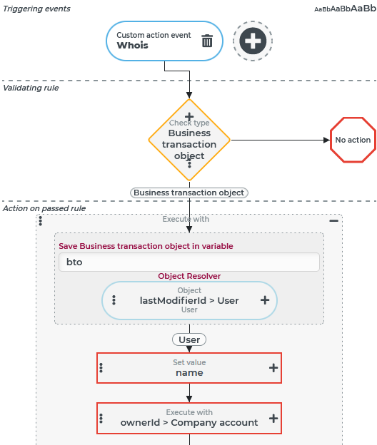 After creating a Custom action event named 'Whois' (WHOIS), it can be assigned to an event handling as a Triggering event. A Check type is selected as the Validating rule, which is based on the type of Business transaction object, which is superior to all business objects. The 'business card' can be displayed with this configuration for Orders, Shipments, Manifests as well as for a Common business object. Since the portal is supposed to combine a few pieces of information from different entities (user and company accounts), these are then first 'assembled' and passed in variables: