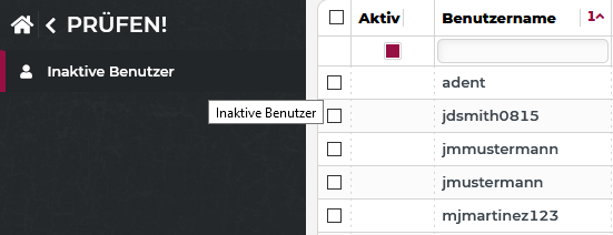 Gewünschter Menüpfad: "Verwaltung / Prüfen! / Inaktive Benutzer"
